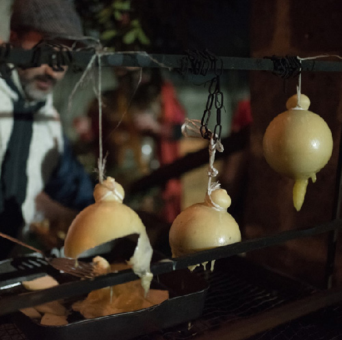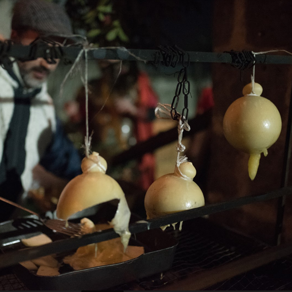Antichissima tradizione del sud Italia. Il caciocavallo impiccato ha un peso tra 1,2 e 2 kg ed è il Signore dell’ardente patibolo. Nel diventare filante cede al passaggio della lama per poi essere spalmato su una fetta di pane “abbrustolito”.